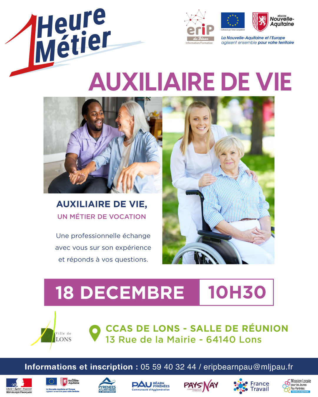 Alors rendez-vous le 18 décembre, à 10H30 au CCAS de Lons, 13 rue de la Mairie à Lons, pour l'action "1 Heure 1 Métier", organisée par l'ERIP du Béarn - Site de Lons. Vous rencontrerez une professionnelle qui vous parlera de son métier d'auxiliaire de vie et qui pourra échanger avec vous et répondre à vos interrogations.