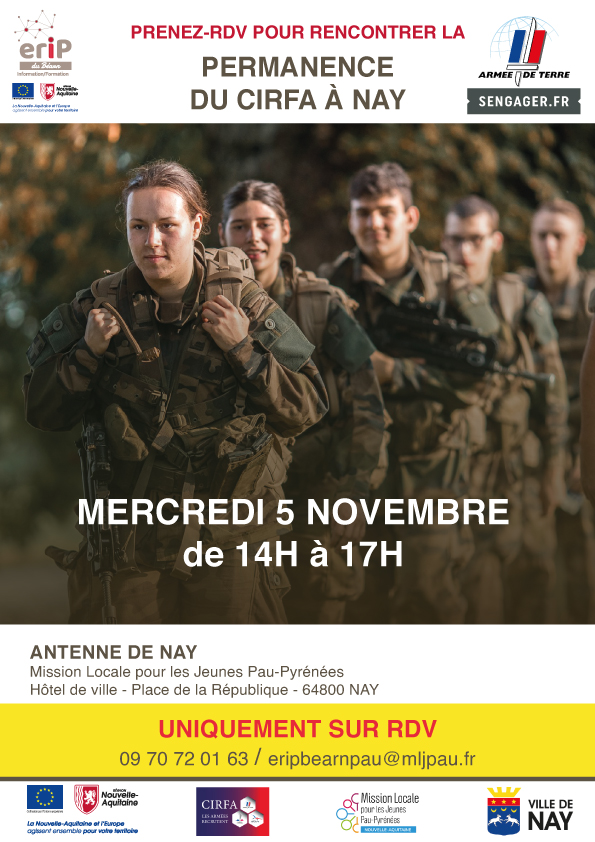 Le CIRFA Terre de Pau sera présent pour une permanence dans les locaux de l'antenne de la Mission Locale à Nay le mercredi 5 novembre de 14h à 16h.