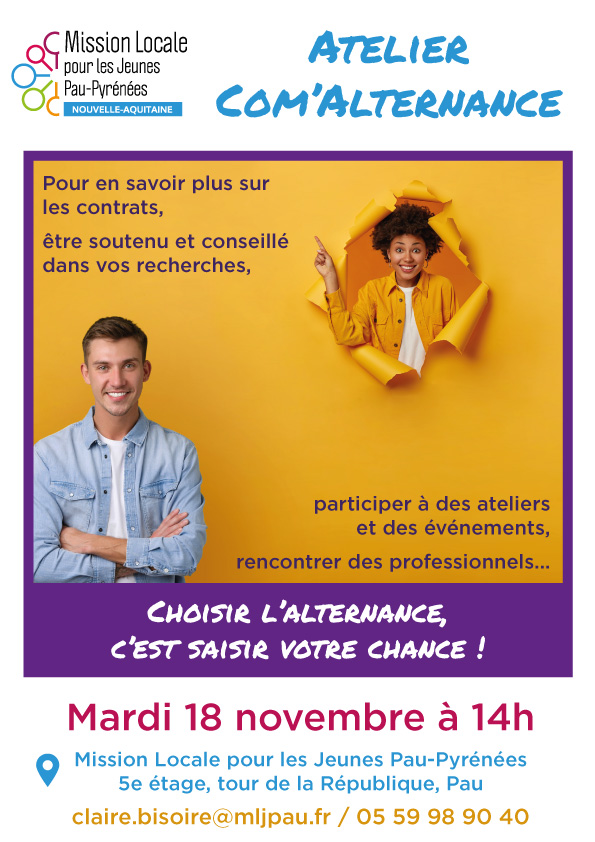 Rendez-vous le mardi 18 novembre 2025, à la Mission Locale pour les Jeunes Pau-Pyrénées à 14h30, 5ème étage de la tour de la République à Pau.