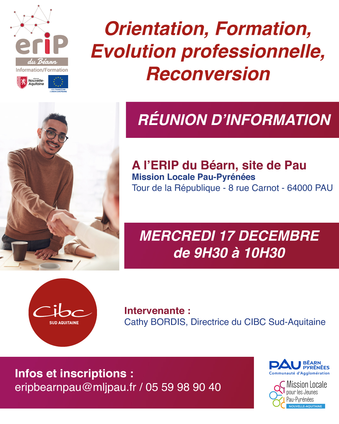 Assistez à la prochaine réunion d'information collective avec Cathy BORDIS du CIBC Sud Aquitaine à l'ERIP du Béarn de Pau - 4e étage de la Tour de la République au 8 rue Carnot :