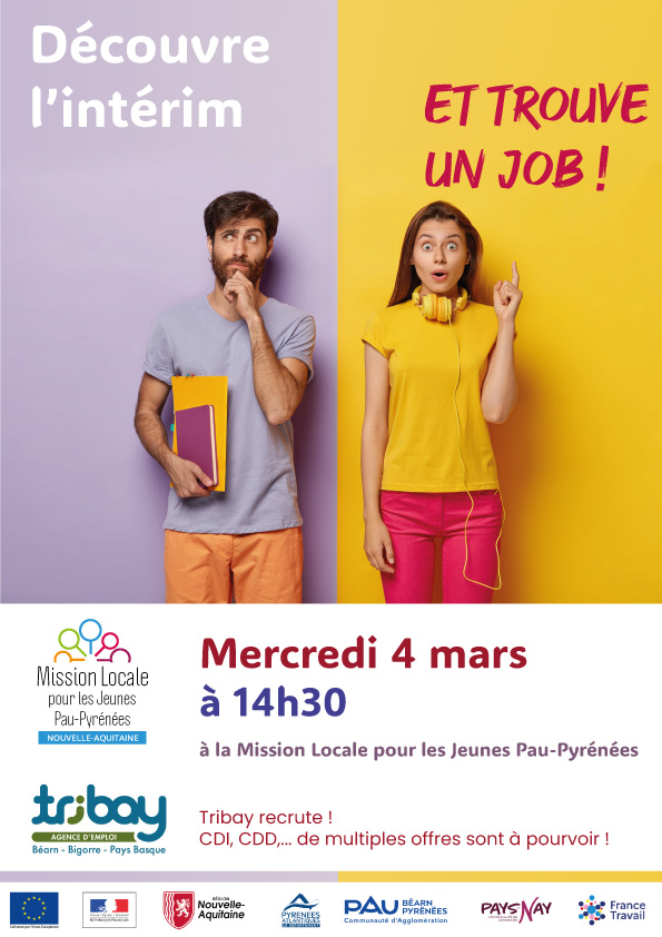 RDV mercerdi 04 mars à 14h30 à la Mission Locale pour les Jeunes Pau-Pyrénées au 5e étage du Complexe de la République à Pau pour saisir cette oopportunité de trouver un emploi et gagner de l'expérience !