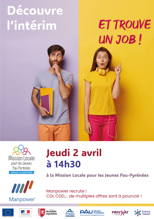 RDV jeudi 2 avril à 14h30 à la Mission Locale pour les Jeunes Pau-Pyrénées au 5e étage du Complexe de la République à Pau pour saisir cette oopportunité de trouver un emploi et gagner de l'expérience !