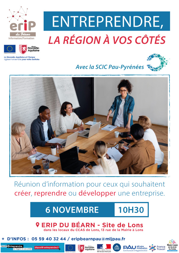 Dans le cadre d' "Entreprendre, La Région à vos côtés", le site de Lons de l'ERIP du Béarn vous accueille pour une réunion d'information avec la SCIC PAU PYRENEES le 6 novembre à 10h30, dans ses locaux au CCAS de Lons.