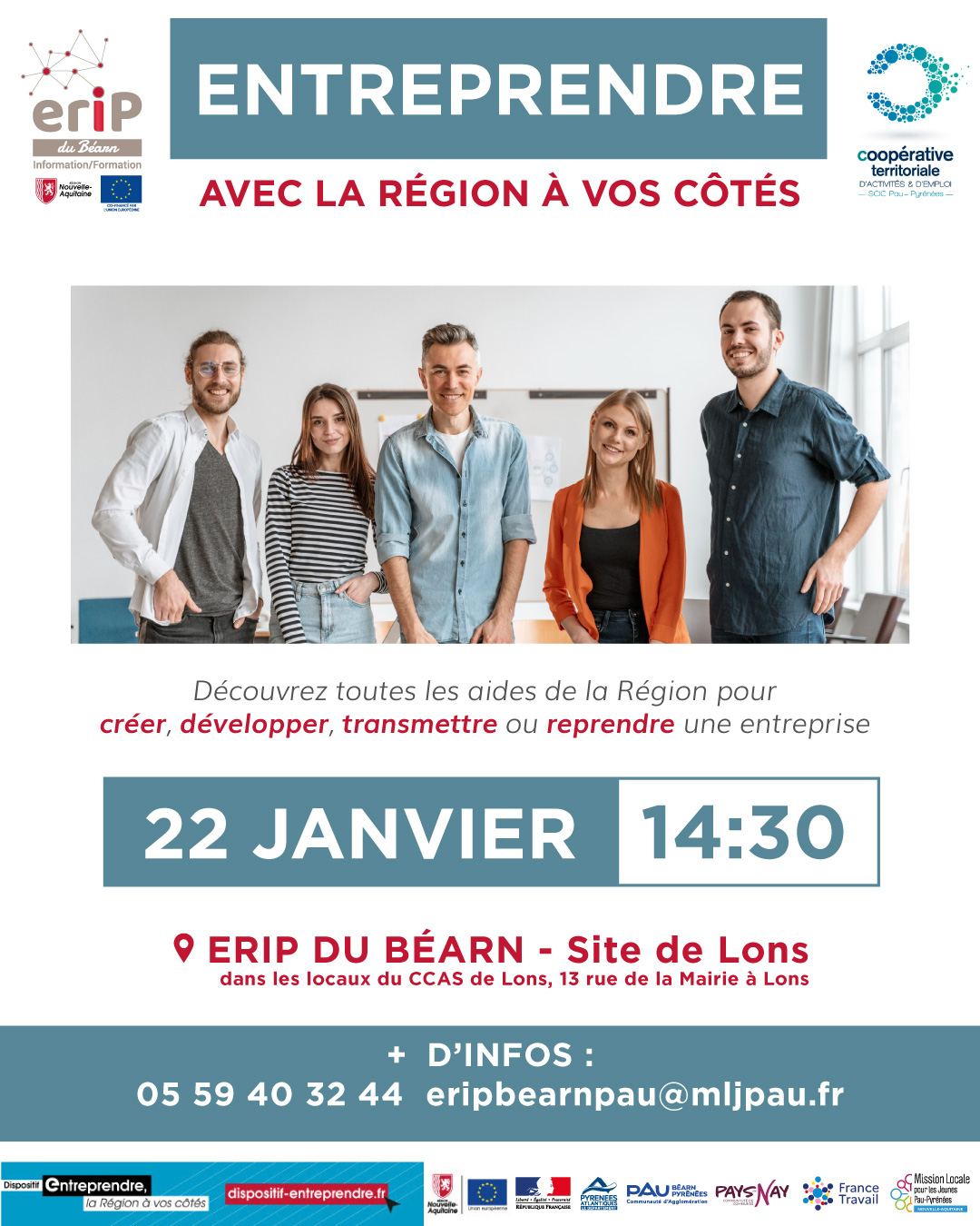 Dans le cadre d' "Entreprendre, La Région à vos côtés", le site de Lons de l'ERIP du Béarn vous accueille pour une réunion d'information avec la SCIC PAU PYRENEES le 22 janvier à 14h30, dans ses locaux au CCAS de Lons.