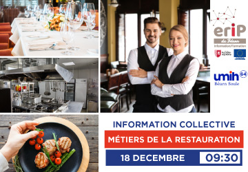 L'ERIP du Béarn - site de Pau, vous propose de rencontrer des intervenants de l'UMIH 64 (Union des Métiers et des Industries de l'Hôtellerie) pour découvrir avec eux les différents métiers de la Restauration (cuisine, service, accueil, management, logistique), leurs atouts, les conditions de travail, les formations et les débouchés,...