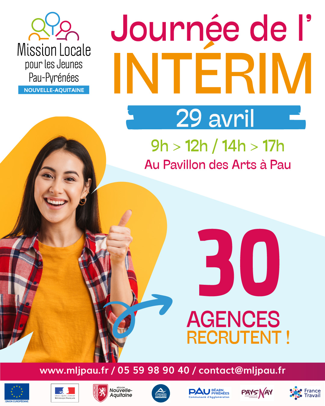 La Mission Locale vous donne rendez-vous à la Journée de l'Intérim, le 29 avril de 9h à 12et et de 14h à 17h au Pavillon des Arts à Pau.