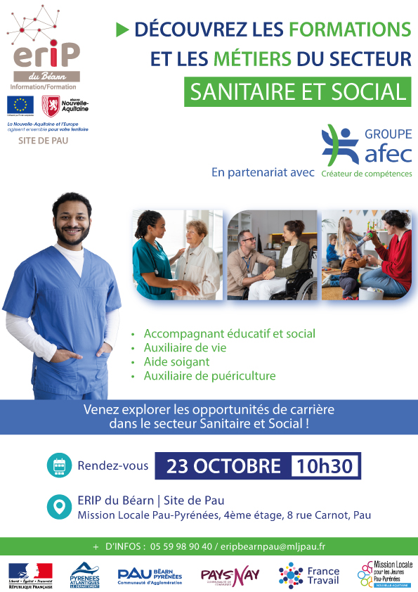 Venez découvrir la richesse des métiers du Sanitaire et Social avec l'ERIP du Béarn et le centre de formation AFEC lors de notre prochaine information collective.