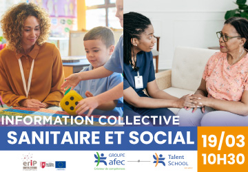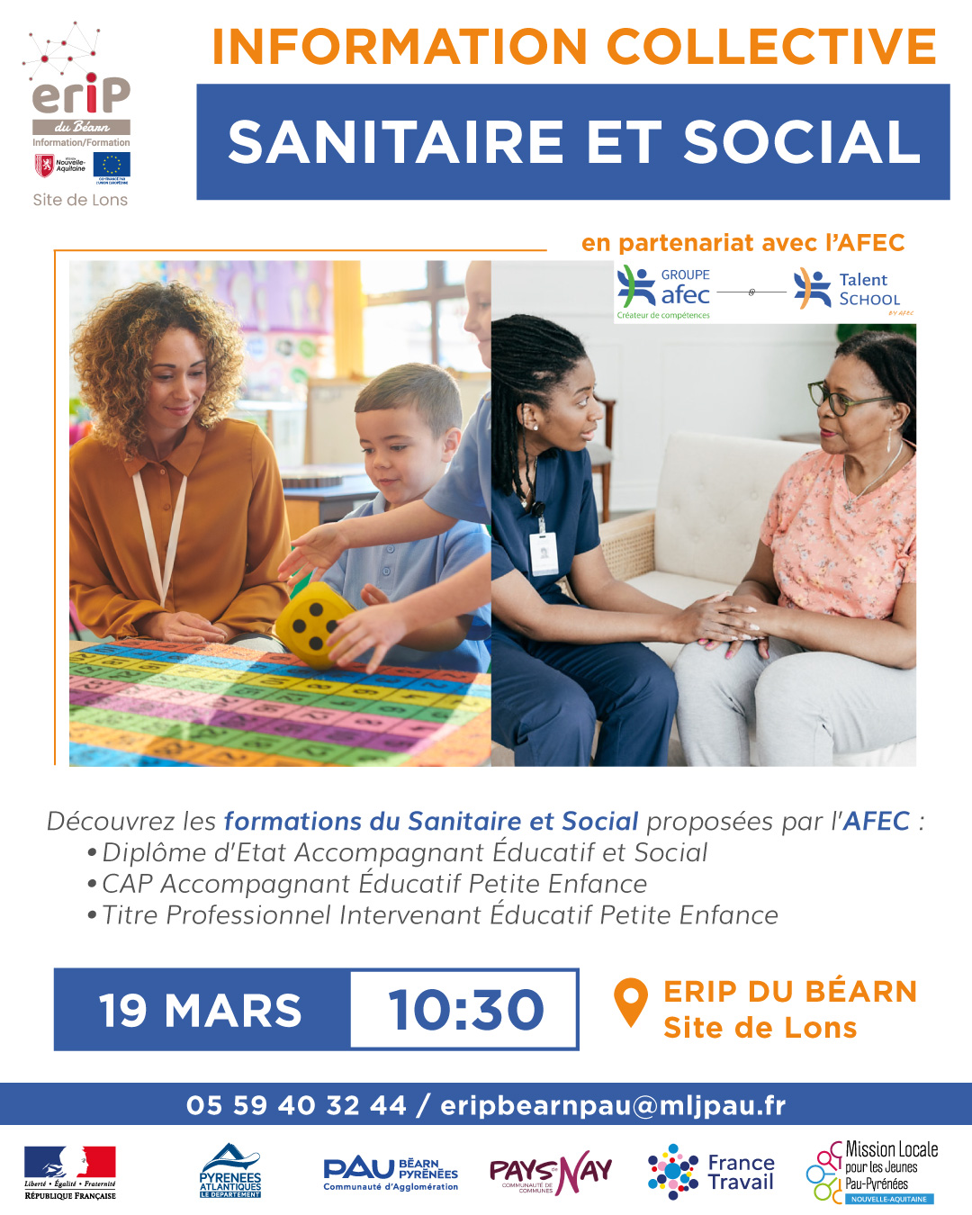 L'AFEC vient vous présenter ses formations dans le domaine du sanitaire et du social lors d'une information collective organisée par l'ERIP du Béarn - site de Lons le 19 mars, à 10h30, dans les locaux du CCAS à Lons (13 rue de la Mairie).