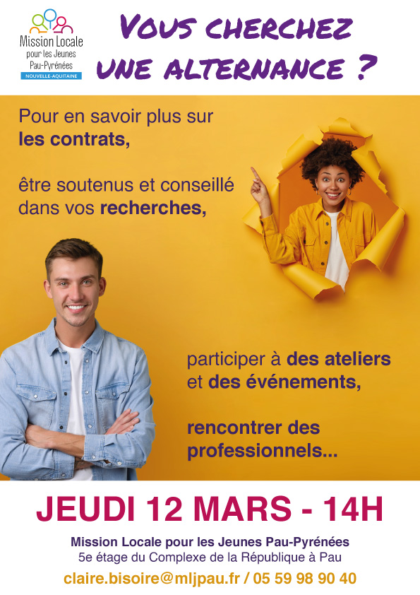 Rendez-vous le jeudi 12 mars, à la Mission Locale pour les Jeunes Pau-Pyrénées à 14h, au 5ème étage de la tour de la République à Pau.