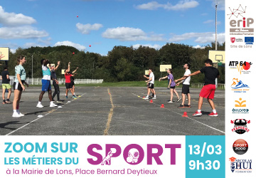 RDV à la Mairie de Lons le 13 mars à 9h30 pour un zoom sur les métiers du Sport organisé par l'ERIP du Béarn - Site de Lons, en partenariat avec HUI Formations, Eklore-ed, le Fitness Club de Lons et Sport 2000.