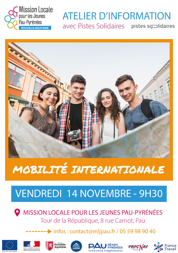 Rendez-vous vendredi 14 novembre 2025 à la Mission Locale pour les Jeunes Pau-Pyrénées, à 9h30 pour une réunion d'information sur la Mobilité Internationale !