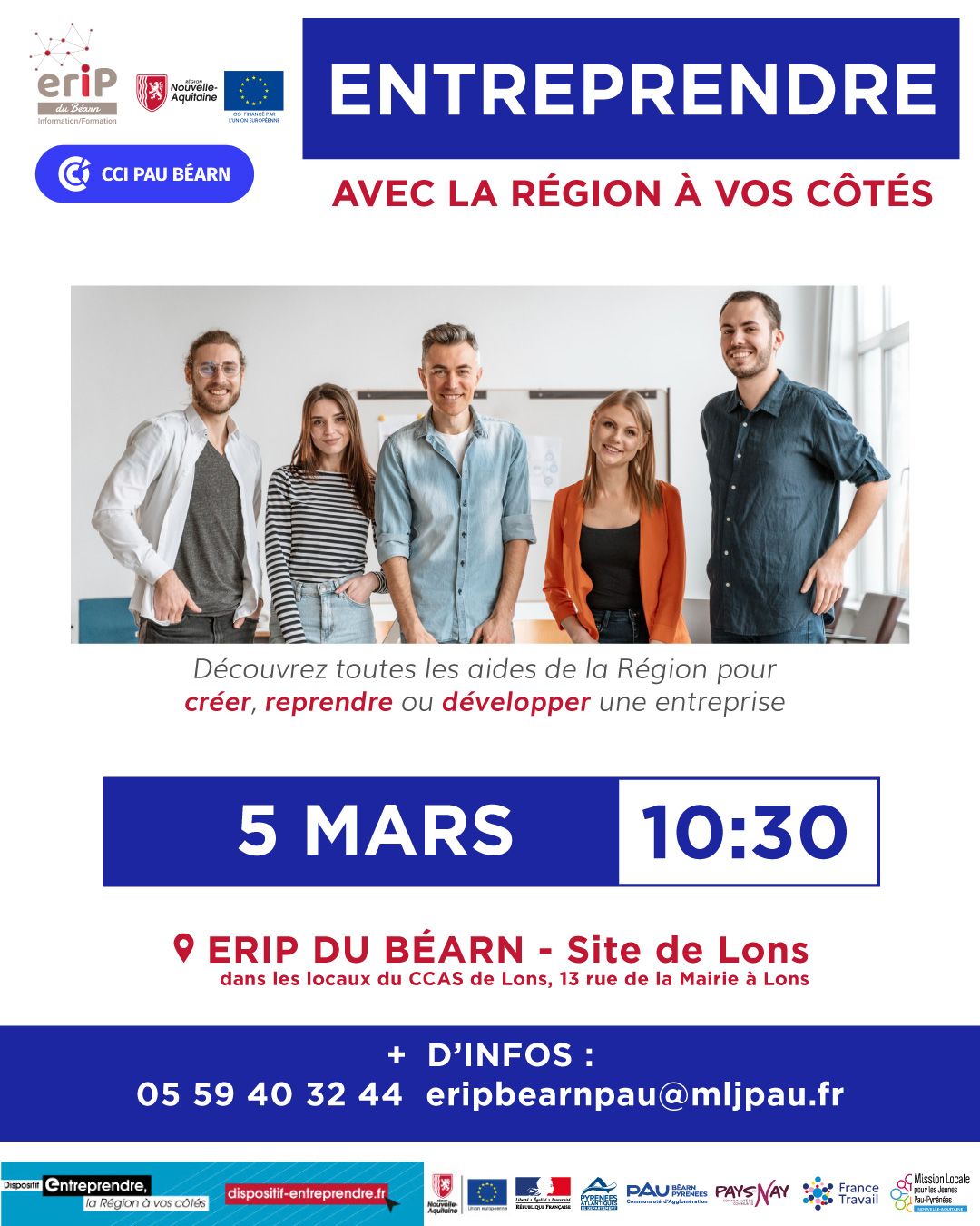 Dans le cadre d' "Entreprendre, La Région à vos côtés", le site de Lons de l'ERIP du Béarn vous accueille pour une réunion d'information avec la SCIC PAU PYRENEES le 5 mars à 10h30, dans ses locaux au CCAS de Lons.