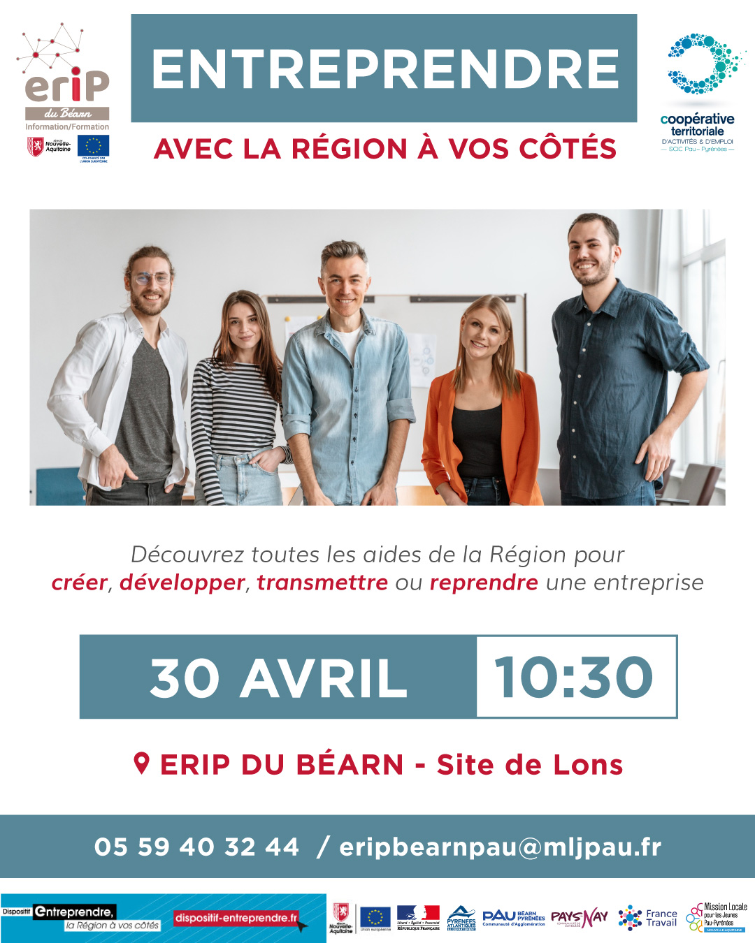 Dans le cadre d' "Entreprendre, La Région à vos côtés", le site de Lons de l'ERIP du Béarn vous accueille pour une réunion d'information avec la SCIC PAU PYRENEES le 30 avril, à 10h30, dans ses locaux au CCAS de Lons.
