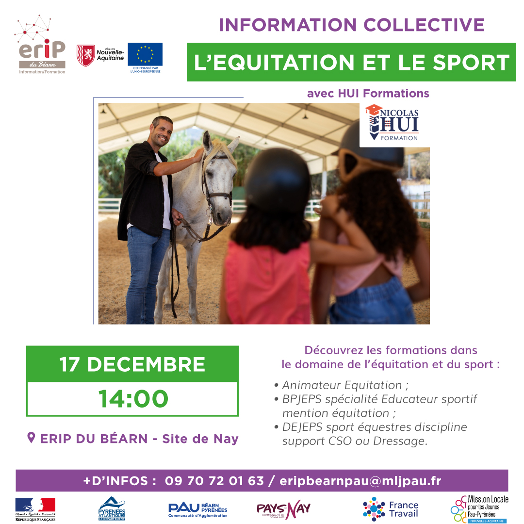 Le 17 décembre, l'ERIP du Béarn - site de Nay vous donne rendez-vous dans ses locaux, avec HUI FORMATIONS, pour assister à une information collective sur l'équitation et le sport.