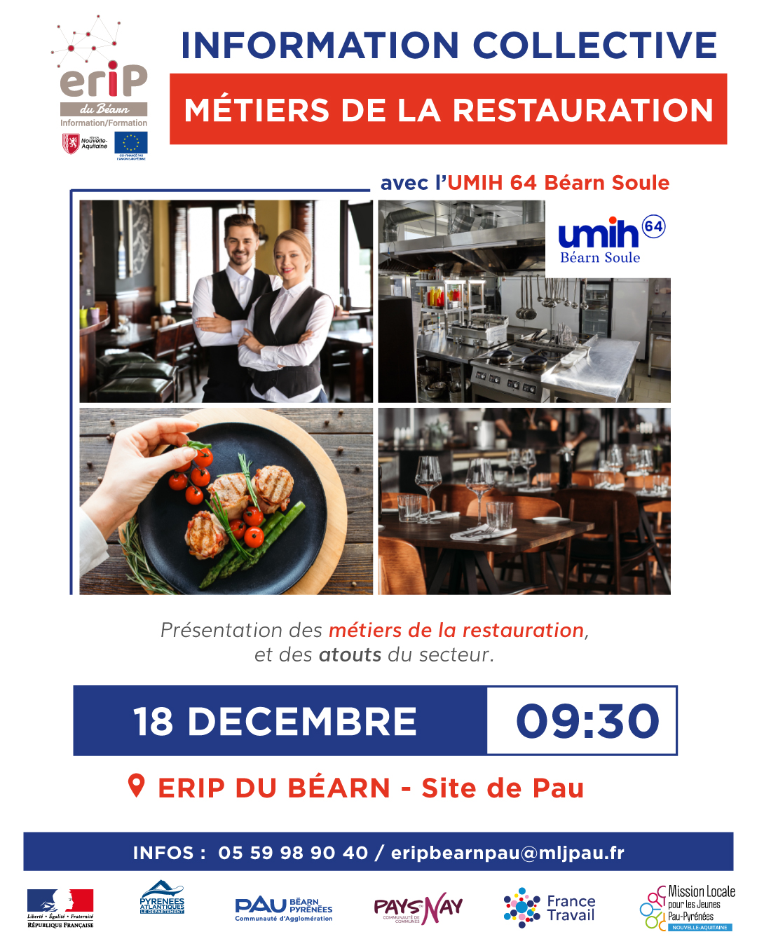 L'ERIP du Béarn - site de Pau, vous propose de rencontrer des intervenants de l'UMIH 64 (Union des Métiers et des Industries de l'Hôtellerie) pour découvrir avec eux les différents métiers de la Restauration (cuisine, service, accueil, management, logistique), leurs atouts, les conditions de travail, les formations et les débouchés,...