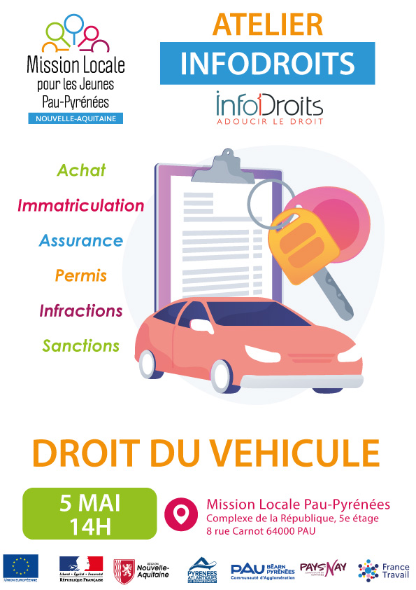 Venez connaitre vos droits concernnant le véhicule et renseignez-vous sur le persmis, l'achat, l'immatriculation, l'assurance et les différents risques (infractions et sanctions) lors du prochain atelier animé par INFODROITS, le mardi 05 mai à 14h, à la Mission Locale, au 5e étage du Complexe de la République, 8 rue Carnot à Pau !